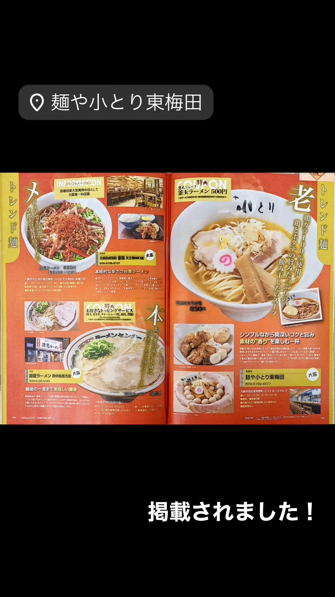 「ぴあ究極のラーメン2025」に弊店「麺や小とり東梅田」が掲... 「ぴあ究極のラーメン2025」に弊店「麺や小とり東梅田」が掲載されました🍜🫧▶︎クーポン提示で、「裏メニュー釜玉ラーメン500円」のサービス提供がございますので本誌ご購入後ご利用くださいませ😊☀️(※本誌…