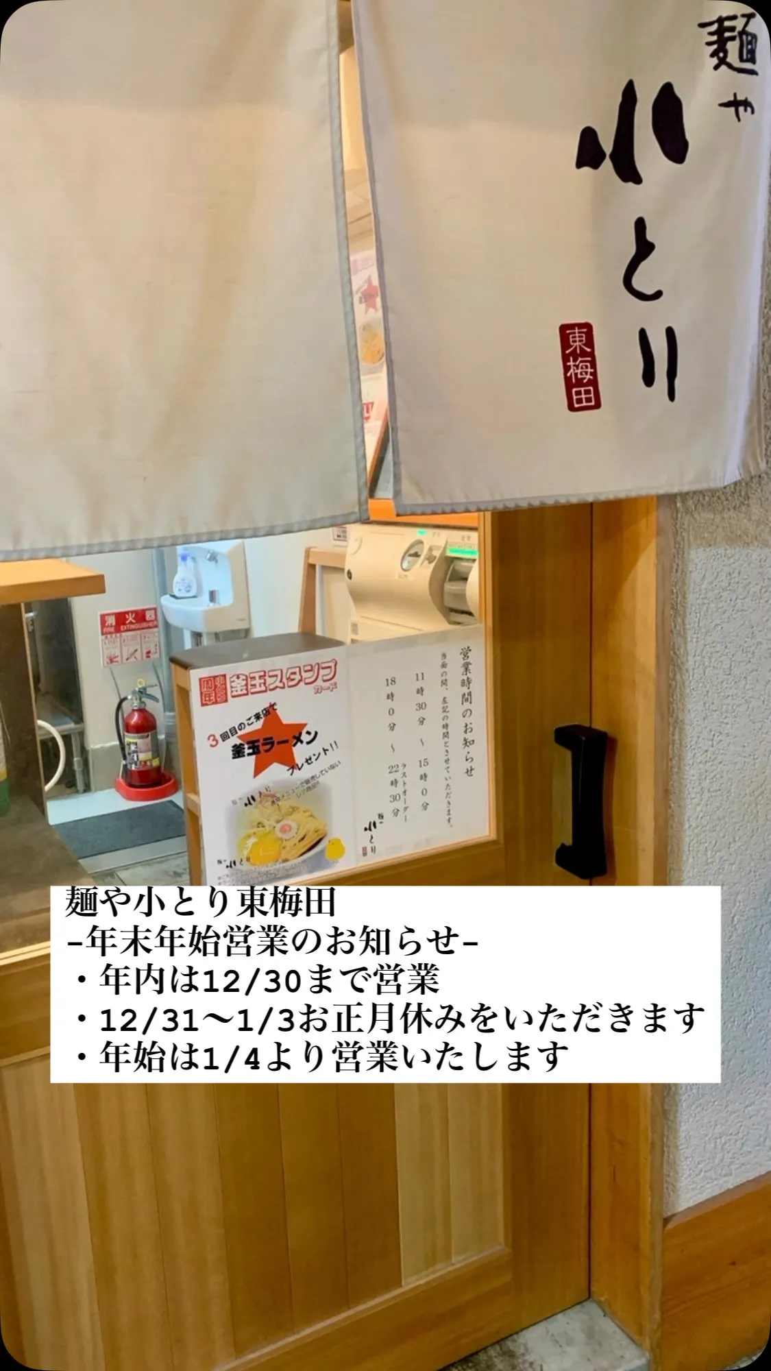 麺や小とり東梅田 麺や小とり東梅田-年末年始営業のお知らせ-⚫︎年内は12/30まで通常営業いたします⚫︎12/31〜1/3お正月休みをいただきます⚫︎年始は1/4より営業いたします師走お忙しいところご自愛くださいませどうぞよろし…